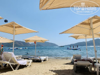 Своего пляжа у отеля, конечно, нет. Но расположение Карена тем и хорошо, что пляж рядом. Мы ходили от отеля направо- на пляж отеля Green Nature Diamond. За напиток можно лежать хоть целый день под зонтиком и на шезлонге. Шезлонги двигали как нам удобно- проблем не возникало. Цены на напитки небольшие. Есть душ. Есть туалет- нужно просто зайти в кафе. Вода чистейшая (налево от отеля более мутная из-за мелкой дисперсии песка). И есть платформа для ныряния!