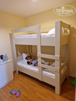 Мы жили в номере с двуспальной кроватью (кровати небольшие)и двухярусной кроватью для детей (взрослый тоже помеящается). Одеял с пододеяльником у них нет. Накрывались только простыней чуть толще чем обычные простыни. Попросили на ресепшен одеяла. Но принесли ужасные тёплые пледы. Видно, что не стираные. Пахло духами