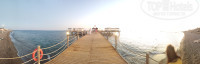 Пляж... достаточно большой. Место мы всегда находили (а нам нужно было 4 шезлонга рядом). Тени достаточно много, но вот чего мало так это урн... Во всем отеле раздельный сбор мусора и на пляже только при проходе на пирс стояли бочки для мусора, приходилось с конца пляжа идти чтобы что-то выкинуть. Так же стояли столики для сбора посуды (но мы люди культурные и мусор туда не кидали), куда мы ставили тарелки и пустые стаканы из под напитков. Пляж песчанно-галечный. Вход в море галька. Примерно метра через 3-4 становится уже глубоко. Во время нашего отдыха море было очень теплым и спокойным (за исключением пары дней волн). Порадовало наличие пирса, на который можно было выйти и покормить рыбок. Так же на пирсе можно было арендовать беседки (35 евро без ограничению по количеству человек).