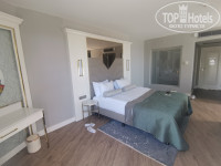 Номер чистый, светлый и просторный. Мебель новая. Большая терраса с лежаками и креслами (очень удобно если у вас маленькие дети и вы укладываете их днем спать - в это время можно спокойно загорать на террасе). Вид на бассейн и на море, а так же на горы. Люблю когда из номера открывается чудесный вид. На верхних этажах море видно лучше. Мини бар пополняется 1 раз в 2 дня (для гостей данных номеров пополняется ежедневно). Единственный минус - чай/кофе забывают пополнять. Один раз напомнили - положили, а потом опять перестали. В ванной комнате есть одноразовые щетки и бритвенный станок (только при заселении). Шампунь, гель для душа и мыло в дозаторах на стене. Убирались в номере хорошо и каждый день. Два раза украшали кровати. Соседей мы не слышали. А вот вечернюю музыку (до 00-30) слышно хорошо. Причем сразу из двух отелей. Wi-Fi работает хорошо на всей территории.