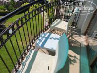 Есть еще номера с других сторон здания. Там вид будет боковой на море, на окрестности со стороны въезда в отель или в сторону бассейна с горками. На мой взгляд, эти варианты размещения менее удачные. В идеале - во внутренней стороне "подковы" на 2-3 этажах. На 1-ых этажах в номерах нет балконов, но есть выход сразу на улицу и площадочка со стульями и лежаком (хотя может кому-то такое и понравится). На четвером этаже номера видимо меньше по площади.