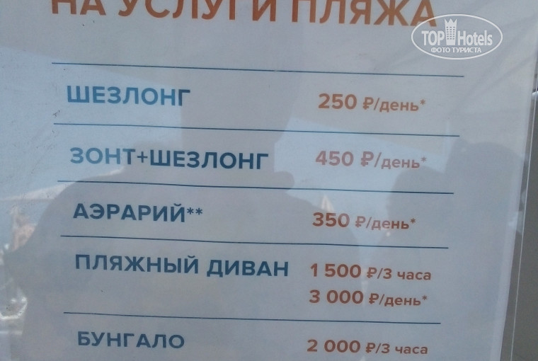 ПЛЯЖ - идти через Екатерининский квартал минут 10-15. Напрямую прохода нет. Так же как и на территорию квартала - проходной двор). И не важно с какого вы отеля или просто сами по себе. Цены на сайте не соответствуют действительности: шезлонг - 250руб/день, зонт+шезлонг - 450руб/день, аэрарий (крытая тентом большая территория + шезлонг и матрас) - 350 руб/день, пляжный диван - 1500руб/3часа или 3000руб/день, бунгало - 2000руб/3 часа или 3500руб/день. На территории пляжа находятся несколько домиков рецепшен, где вы покупаете нужную вам услугу и вам за это дают бумажный браслет (на сумку). Каждый день цвет браслета РАЗНЫЙ и в течении недели не повторяется. Если вы не оплатили услугу (шезлонг/диван/бунгало) - не расстраивайтесь, несколько раз в день ходят проверяющие с терминалом (можно и наличная оплата), просто оплачиваете и все, никто вас не выгонит..... А бывает и не проверяют;) Достаточно переодевалок, душ под открытым небом, урны для раздельного сбора мусора, туалеты за территорией пляжа (бесплатные).
