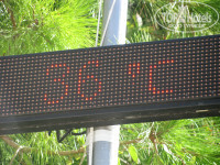 Температура воздуха у нас достигала 38 градусов. "Градусник" есть на нашем пляже. Он также показывает время и дату. Море было тёплым. А после сауны вообще было приятно плавать в море.