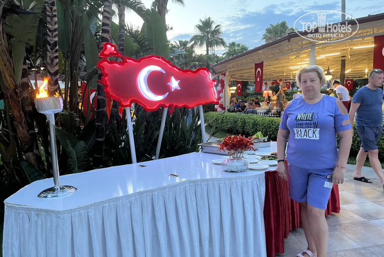 Отдыхали с мужем в июне месяце, погода была теплая, один раз утром прошел дождь, но настроение нам это не подпортило, потому что дождь прошел быстро и выглянуло солнце. Море три дня бушевало, но мы в это время были в бассейне. Аниматоры просто супер, программа разнообразная, скучно не будет. Теннис, волейбол, всегда пожалуйста. Еда это круто, разнообразие, никогда не бывает пустых лотков, сразу пополняют, фрукты то же самое, клубника, черешня, абрикосы и т.д. Есть горки как для взрослых, так и для детей. Вечером каждый день программа для детишек, далее для взрослых. Дискотеки, раз в неделю поездка в клуб. По приезду посетили хамам, действительно загар лег ровно. Массаж это отдельная тема, промассажировали так, что тело еще долго будет помнить.