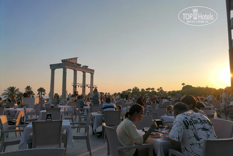 В ресторане большой выбор блюд, кроме привычной курицы были баранина, утка, рыба,диетический стол. Много сладостей и фруктов. На завтрак вкусные пышки, оладушки, омлеты. Ужин всегда на открытом воздухе, повара готовят на глазах вкуснейшую утку и пловы. Мороженое давали на ужин в пн, ср и пт.
