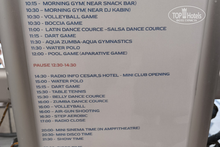 День здесь начинается с отельного танцами, им и завершается. Анимация проходит с 10 до 12.30, 14.30-17 + вечер(музыка в столовой, просмотр мультиков в амфитеатре, мини диско, вечернее шоу, дискотека в клубе). Кстати удобно : на мини диско детей забирают прямо из столовой. На ужин рекомендуем сидеть на террасе, так как и закатом можно насладиться, и музыку послушать, потанцевать, gala ночь тоже проходит здесь. Возможно в первый день вы не поймете где проходят все активности, например, вы проводите время на пляже, а дартс, настольный теннис, стрельба проходят у бассейна главного корпуса. Но теперь вы знаете, куда идти)