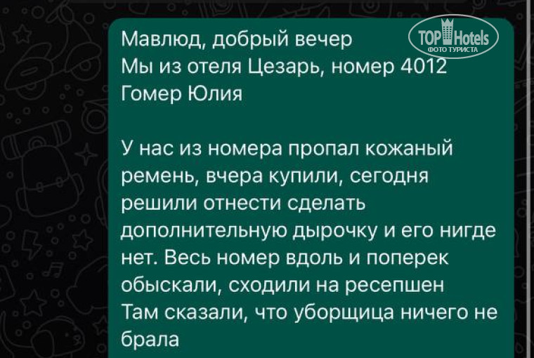 7 или 8 числа мама купила на рынке рядом кожаный ремень, пришли в номер и закинули его ко всем покупкам (как это обычно бывает, чтоб в конце отдыха все собрать в чемодан) в сейф мы прятали только очень ценное (документы, украшения и тд.) я и представить не могла, что нужно будет прятать и покупки тоже! на следующий день, в свой день рождения!! мама подумала, что нужно бы сделать дополнительное отверстие в ремне, и мы решили после праздничного ужина, вечером, вернуться к продавцу с ремнем, чтоб на месте все решить. начали искать ремень, а его нигде нет! обыскали весь номер вдоль и поперек, нигде нет. выкинуть его не могли, он лежал вместе со всеми покупками безделушками. отправились на ресепшн, объяснили ситуацию, девушка ничего дельного не сказала, и предложила ждать утра (когда придет начальник уборщиц) мы попросили написать смс тут же, по горячим следам, чтоб она просто вернула вещь, нам разборки не нужны.