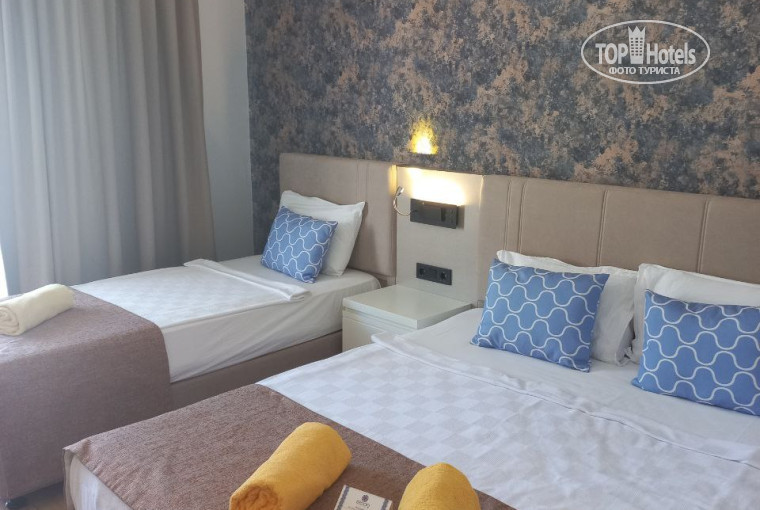 Нас заселили в первый корпус, номер дали с прекрасным видом на бассейн и горы. При заселении в номере была 1 большая кровать и 1 односпальная нам оперативно принесли еще 1. В итоге все кровати стояли впритык друг к другу, но нас это не напрягало. Номер новый, аккуратный, все исправно. Есть сейф, wi-fi (он периодически слетал, но в принципе нормально тянул везде и даже на пляже).