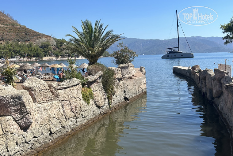 Он находится действительно близко,есть лежаки от отеля.НО. Вода грязная,рядом канал фото прикрепила.Но дальше есть общественный,там вода чище,лежаков нет ,но есть зонтики.