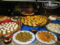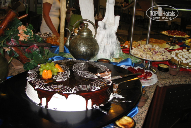 Впрочем, самый большой шок мы испытали, спустившись в главный ресторан. Там было какое-то нереальное количество людей. Мы несколько минут бродили в поисках свободного столика. Застолбив наконец-то место, мы отправились за едой... надо сказать, что свободно подойти к столикам с едой удавалось не всегда... особенный ажиотаж наблюдался у гриля... люди вставали в очередь, даже не зная, что дают на другом конце... отстояв и поняв, что им это не надо, они набирали все равно!!!!!!!! Расстроенные, с кислыми лицами и полными тарелками того, что им и есть-то не хотелось, возвращались за столики… в результате почти полные тарелки еды выбрасывались... из-за подобного ажиотажа припозднившимся туристам просто недоставалось некоторых блюд (буквально моментально сметался особенно любимый русскими салат оливье "турецкого разлива", ряд мясных блюд, черешня и др.)... вместо закончившегося оливье ставили изрядно поднадоевшие всем огурцы, а вместо черешни – недозрелые дыни и яблоки. Неприятно поразил нас и ресторанный сервис: на столах практически никогда не было приборов, бокалов и салфеток! Постоянно приходилось напоминать об этом официантам, которые улыбались и понимающе кивая, все же нести их не торопились. В конце концов, нам это надоело и мы ходили за всем необходимым сами. Хотелось отметить еще вот что. Избалованные сервисом трехзвездочного Максим Шекер Резота, мы поначалу просиживали в ожидании, когда находчивые официанты подойдут к нам и поинтересуются, что мы будем пить (пиво, вино и т.п.). Но так и не дождавшись от них подобного сервиса (что весьма странно для 5*), пару раз поймав их за руку и заказав бокал вина, поняли, что быстрее было бы сходить три раза самому, что мы и делали в дальнейшем. Из положительного хотелось бы отметить только сладкий стол – он был по-настоящему разнообразен.