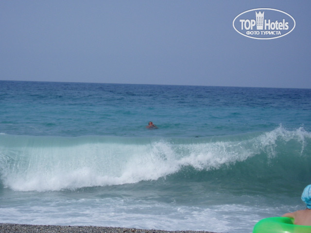Большой минус - вход в море, так сильно и не выяснила всегда ли там так.. там волны большие (фотку приложу), именно у берега, и при входе лежат битонные плиты, камни, по плитам еще с горем пополам можно зайти, по камням нереально - скользкие. В общем детям в море зайти вообще проблема :(