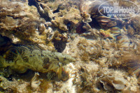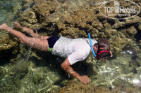Отдельная история - рыбки. Без маски делать нечего. Пожалел, что не купил чехол для фотоаппарата. На пляже есть как-бы полянка, где рифы немного расступились и песок. Оттуда можно стартовать. Везде мелко. Можно плавать за одной, становишься юнным натуралистом. Каждый день открываешь новый вид. С понтона (в основном после обеда) видишь риф со стороны моря, дна не видно, стаи рыб. В маске плавать легко, хотя конечно течение есть.