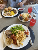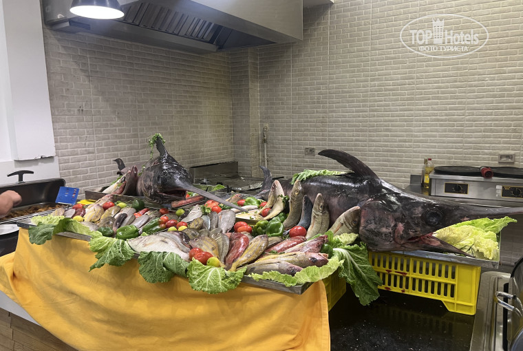 Главный ресторан с видом на море, очень большой. Еда отличная. Всегда есть курица, говядина, индейка, рыба, кальмары, один раз за неделю были перепелки на гриле, мои любимые овощи - гриль на ужин, овощи тушеные, рис, картофель, мясные рулеты, лазанья, один раз были роллы-вполне даже съедобные, хороший выбор сезонных фруктов, свежие финики-божественны) На ужин- большой выбор разнообразных пирожных и восточных сладостей. Повара, конечно, молодцы, стараются. На завтрак всегда есть фреш, свежие горячие круассаны, блинчики, яичница, овсянка, овощи, тосты, йогурты, сыры творожные очень вкусные, разнообразная выпечка. Всегда всё свежее. Расстройства желудка не было). Всегда всем всего хватало, очередей нет. Алкоголем не увлекалась, коктейли, вино довольно таки сносное, пиво вкусное, пили постоянно. Днём у бассейна и на пляже разносят коктейли и закуски. 4 ресторана а-ля карт, за неделю можно посетить 2 раза, по предварительной записи день в день. За аквапарком есть снек кафе, где есть картошка фри, пицца и пекут вафли и оладьи.