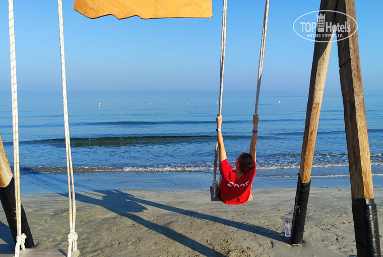 Пляж огромный. Метров 500 точно. Мягкий белоснежный песок и пологий вход в море. Рай!) Имеются приливы и отливы. При высоком росте есть вероятность дойти пешком до буйков. Отличная качель с видом на море. Бар, а также отдельный вагончик с напитками. Шезлонгов хватает. Полотенца можно менять неограниченное количество раз за день. Погода была +35, море очень тёплое.