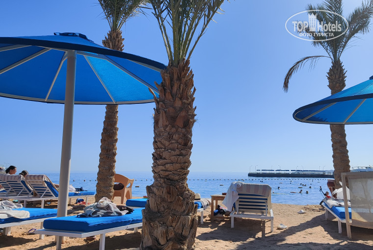 До моря пешком через дорогу и соседний отель Альбатрос Бич 12 минут, кстати, в этом отеле есть прекрасные локации для фото, а какая шикарная пальмовая аллея. Также можно доехать на трансфере, ходит с 8:30 до 17:00. На пляже есть место для перекуса на крыше одного из здания Альбатрос Бич, оно находится на некотором отдалении от пляжа, и можно еду взять с собой в ланч боксе уже на сам пляж. На самом пляже есть бар с напитками. Отличный вход с берега в море, с песочком, пологий. С пирса сразу глубина, и место для плавания очень ограничено, рифа нет, но живности хватает, видели и скатов, и мурену, и остальных частых обитателей Красного моря. Лежаков на пляже для зимнего периода хватало, но в высокий сезон придется поискать место под солнцем, т.к. пляж небольшой.