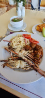 На пляже бар, там же в обед можно перекусить, (бургеры, фрукты, мясо, пицца)