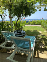 В итоге на третьи или четвертые сутки мы переехали в бунгало. Там я практически разрыдалась. Не номер – хижина хоббита. Низкий потолок, места мало. Входная дверь и окно – единый блок, проходишь через номер, попадаешь в ванную. В качестве допкровати предлагалось раскладывать диван, но ребенок спать на нём не смог. Принесли раскладушку с матрацем. Но зато там реально тихо, ночью слышен плеск волн. Кроме того, перед каждым бунгало – лужайка, на которой стоят два шезлонга, столик и стулья. Над лужайкой натянуты веревки, по которым вьются цветы и тыквы. Очень круто полежать вечером под шум прибоя или днем отдохнуть в теньке, любуясь на море. И до главного, самого хорошего пляжа, буквально пара шагов.