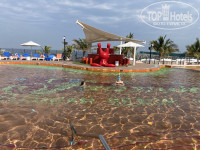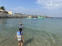 Вода на пляже прозрачная, в начале отдыха была теплая, наверное +24, потом стала прохладнее и начался ветерок, вторую половину отдыха купались в бассейне, там теплее. Дети с удовольствием бегали по надувному аквапарку, но когда начался ветер, его убрали. Обязательно берите с собой маску, возле камней много разных рыбок, возле надувного аквапарка видели двух черепах, интересно с ними было поплавать. Бесплатно дают жилеты.