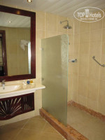 Не волнуйтесь за то где вас поселят. Отель построен очень продумано, и все окна выходят во внутренний двор, так что у вас точно не будет вида из окон на стройку или в пустыню. У вас либо будет вид на море или бассейн, либо на зеленый газон с пальмами и соседний корпус. У нас был отличный номер (и насколько я видела когда мельком заглядывала в окна других номеров – по состоянию все одинаковые). Мебель новая (отелю 2 года) и в хорошем состоянии, стиль номера очень даже удачный, дизайн симпатичный. Нам, по ошибке дали вместо одной кровати King size – 2 кровати Quinn size. Мы их сдвинули и обнаружили, что даже нет щели между матрасами. Было очень удобно, и кровать получилась просто огромная, и на ней можно было кувыркаться, и прыгать и вообще было весело. За номер не переживайте вообще, можно ехать в этот отель и рассчитывать что будете жить в отличных условиях! Кондиционер довольно шумный, но охлаждает эффективно. Если вам ночью очень жарко в комнате, но кондиционер шумом мешает спать (нам не мешал), то можно действовать так: на комнату дают по 2 карточки, одну карточку можно оставить в датчике на электроэнергию на входе, включить кондиционер на охлаждение, взять вторую карточку с собой и уйти на вечернюю программу. К тому времени как вы вернетесь номер будет хорошо охлажден и вы сможете спать в тишине и прохладном номере. И последний момент на счет ванной. Ванная тоже очень симпатичная, все новое и чистое. Всем приятно пользоваться. Лично мне не очень понравился их гель для душа, потому что он был слишком насыщенным синим красителем, но это не проблема. Душ висит от потолка. В виде большого блина. После того как вы примете душ из него может шумно капать вода из за конструкции душа. Просто наклоните диск душа после использования что бы вся вода из него вылилась и он не будет вас беспокоить.