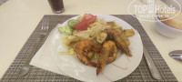 на завтрак жарят яичницу, омлет, пекут блины,вафли,и круассаны вкусные очень,пончики, варёные яйца, сосиски, хлопья, молоко, фрукты, зелень, овощи. Кофе растворимый в бочке, и отдельно сухой в банке.Почему бы не поставить кофе машину ,как везде не понятно.На обед два вида супа, мясо, паста, рыба в кляре, фри, овощи тушёные ещё много всего. На ужин почти тоже самое плюс мясо или курицу запечённая порционно отрезают, бефстроганов, роллы ( не очень), бургеры,шаурма,два раза были креветки с кальмарами. Пасту при тебе делают.На улице люля, пиццу пекли. Огромное количество сладостей и мороженое на обед и ужин вкусное .Пища почти вся специфическая, на любителя. Но вполне можно найти на каждом приёме пищи несколько позиций по вкусу.Голодным не останешься. Место в ресторане с начала было найти легко, половина на улице кушает, половина в помещении, но по мере заполняемости отеля, персонал уже не успевал перенакрыть столы. Вообще молодцы стараются, всё быстро сделать. Еда пополняется, столы убирают. В принципе не имеет значения когда ты приходишь в начале или в конце еда будет та самая. По есть можно практически всегда или на пляже или около бассейна.