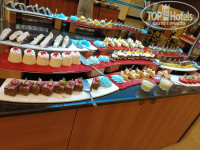 На завтрак стандартное в целом все; омлеты, яичница, сосиски, картошка, йогурты, каши, колбасы, сыры (вот их было много видов 12-14), овощи, зелень, из фруктов апельсины, грейфрукты, груши бананы, блины, круасаны, тосты, джемы варенье, халва меды, и мед в сотах, печенюхи ну и прочие сладости, гречка даже пару раз была) и ну и прочая еда. 2 кофемашины, 2 станция турецкого чая с чайниками, и автомат с соками юпи.