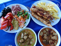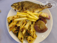 На обед те же самые овощи, фрукты, зелень, соленья, салаты разные, гарниры нескольких видов (макарошки. Рис, картошка фри и обычная, овощи) мясо тоже разное, курица нескольких видов, говядина, иднейка, телятина, баранина иногда, рыба в соусе и на гриле, Ну и та же курица, индейка и т.д. на гриле. В общем каждый день было разнообразие в мясных блюдах 5-6 вариантов всегда было, не много и не мало, два вида супов. Торты и сладости турецкие и стандартные бисквиты пирожные, не сказать вау но нормальные вполне. С обеда уже работал бар в ресторане так что разный алкоголь можно было брать уже.