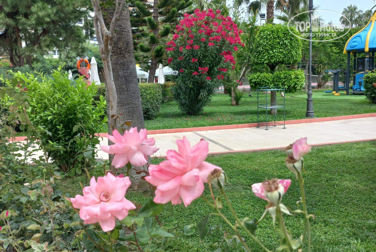 3) Территория очень ухоженная красивая,везде цветут розы, и другие цветы,деревья все в цветах.Есть лежаки типа гамаков,беседки ,и скамейки везде.