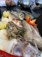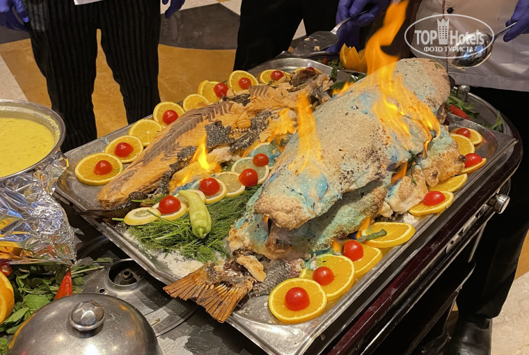 Ресторанов на территории отеля было много, начну с главного, он не маленький, можно сидеть и внутри и на террасе. Сам шведский стол не сильно огромный, но покушать найти всегда можно, все съедобное и выбор был! Есть горячия станция, есть угол с салатами, с выпечкой, что хочется отметить, выпечка действительно хорошая. Были десерты и фрукты. На террасе у них стоит гриль кухня, разное мясо и рыба каждый день на обеды и ужин И рядом делают пасту, на завтраках там делают омлет и вафли или панкейки. Наслаждались, когда было рыбное меню. Хотелось бы чтоб арбуз и дыню давали не только на ужин!