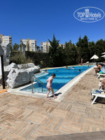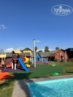Территория отеля,где основное здание совсем не большая ,погулять с ребенком на коляске особо не где,пару бассейнов взрослых и один детский,еще есть детская площадка .
