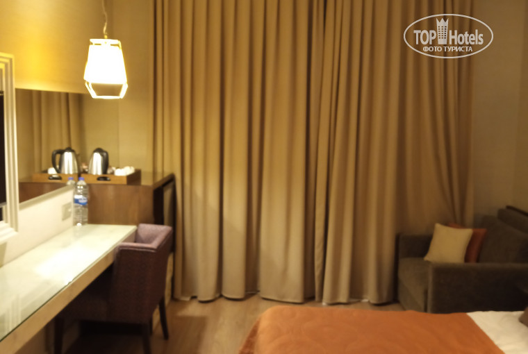 Что касается самого номера - нас ждали тапочки, шампунь, кондиционер, гели и кремы для тела, паста, зубные щётки, бритвенный станок, расчёска и т.д. Прекрасная душевая кабина, откуда ничего не выливается за ее пределы. Хороший напор, всегда горячая вода. На стене в комнате огромная плазма. Каналов много, правда российские, как обычно, все неинтересные. Нет ни Первого, ни НТВ. Только Планета, ТНТ (почему-то в Турции во всех отелях его считают важным для россиян) и какие-то рекламные.