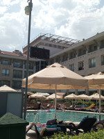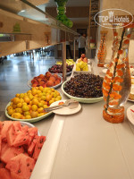 Тут всё великолепно! На любой вкус всё есть. Перечислять не буду. Имеется и диетический стол с несолёной и приготовленной на пару пищей. Сладкие столы лучше обходить стороной! Иначе будет не оторваться, и лишние 5 кг обеспечены! Из фруктов - арбуз, дыня, черешня, клубника, слива, персики. Напитки тоже на любой вкус - чай, вино, пиво Туборг, соки, коктейли и т.д. Кофе и айран - всегда, а не по определённым часам!
