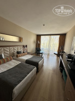 Размещение. Нас поселили в номере на 3 этаже #313, из которого было видно бассейн и кусочек моря. Номера большие и комфортные. Но на глаза попадает то обшарпанный угол комода, то грязные обои. В принципе мы не обращали внимание. В номерах разлито мыло в дозаторах (он же шампунь), один комплект ушных палочек, пара ватных дисков, почему-то одна шапочка для душа. На протяжении всего отпуска ничего из этого не обновлялось - на 5 звезд не тянет. Есть тапочки.