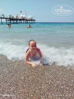 Море. Очень тёплое и достаточно чистое. Пока не сдувает мусор с пирса). Все дни были волны. Спокойно не поплавать. Пляж там ни разу не песочный. Где лежаки, там да. А дальше галька. И берег и заход. И совсем не мелкая. На дне есть и большие камни, но они больше как платформа, особо не мешают. Заход достаточно резкий. Малышам не очень. Но море всё равно шикарное. С пирса можно понырять. Ну и больная тема:лежаки. Что на море, что у бассейна. Стоят обмотанные по 2-4, а то и по 6 штук друг за другом. Кладут что угодно. И трусы и майки и тапочки из номера. Мы подходили, убирали, располагались. Дважды посчастливилось увидеть эти "хозяев жизни". И оба раза это были европейцы. Были крайне не довольны, что на них четверых осталось только два лежака. И вообще европейцев и турок очень много. Они составляют большую часть. И ведут зачастую себя по хамски. Например закурить в очереди с детьми на карусели, а на замечание махать руками, что здесь же небо. Откровенной дискриминации со стороны персонала не заметила.