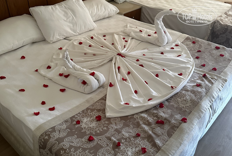 Кстати спасибо отелю, нас красиво встретили, на фото видно как украсили номер в первый день, принесли в номер тарелку с фруктами и шампанское, на ужине также угостили тортом и вином. (За это спасибо и туроператору)