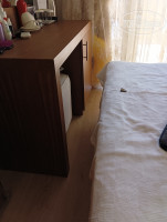 Я вся в синяках, одни углы. Зачем то поставили под стол пуфик, который просто не вытащить. Узкий шкаф, посмотрите на фото и один нормальный шкафчик, для четверых не много места.