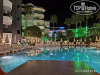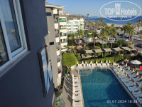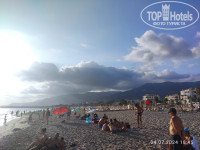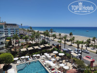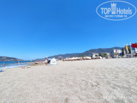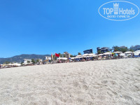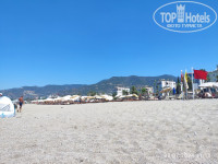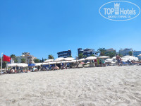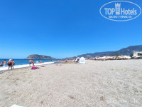 Территория отеля компактная, но места всем хватает. На территории и в подземном переходе есть магазинчики, где продаются по доступным ценам плавательные принадлежности, сладости, детские игрушки, тапочки, сланцы, спиртное, сигареты и др. Также рядом с территорией отеля есть множество других магазинов и баров. Помимо этого на территории отеля есть 3 бассейна, 3 бара, одна детская Аква горка, детские комната и игровая площадка. У отеля свой широкий пляж с достаточным количеством лежаков. Однако они расположены достаточно далеко от воды, что не удобно с детьми, которые постоянно плещутся на берегу моря. С учётом того, что пляж широкий можно непосредственно поставить свой зонт и подстилку непосредственно у моря! Рядом с пляжем отеля есть офис, где предлагаются водные развлечения за плату. По пляжу стоит отметить, что сам пляж песчаный, непосредственно вход в море галечный, достаточно резкий, с перепадом до 0.5 м, видимо из-за гористой породы. Море на данном побережье постоянно с волнами, достаточно часто с весьма большими. Это для детей прикольно, но для тех людей кто плохо плавает думаю что не очень, просто не поплаваешь. Большинство отдыхающих стоят в линию и пепрыгивают волны. Повторюсь видимо в данном месте это постоянно! На пляже можно бесплатно попить воду, чай, кофе, типо соки-компоты.