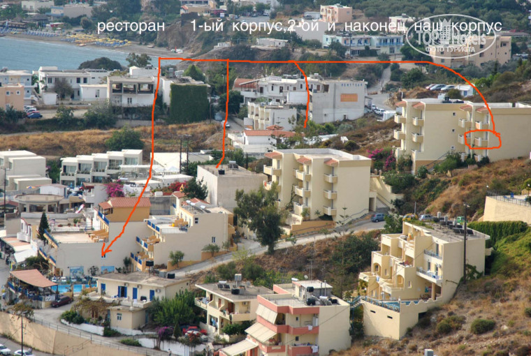 Отель неплохой, убирались у нас каждый день, полотенца меняли раз в два-три дня. Кормили скромно, но всегда было из чего выбрать. Вид из окон просто восхитительный и каждый день и вечер разный. Поэтому, чтоб полюбоваться и вам на эту красоту прилагаю фото. Не понравилось лишь то, что хозяин отеля решил, что раз мы молодые, то можно нас поселить на самой высокой точке отеля, взбираться туда было даже нам полу спортсменам тяжеловато.(так же прилагаю фото расположения отеля и нашего номера, обведено красным). Пляж находится в 2-х минутах ходьбы, есть маленький и большой, пляжи чистые, все с душевыми. Полно маленьких супер маркетов, сувенирных магазинов, а так же есть несколько баров и клубов недалеко от отеля.