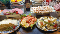 Ужин разнообразнее, нет мешанины салатной, много овощей запеченых, салатики из синеньких..запеченая картошка, рис, макароны.. Из рыбы часто дорада и красная.. Два раза крутили ролы, вкусные, язык был пару раз, салаты с креветками и кальмарами)