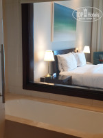 Есть не только душ, но и ванная с панорамным окном с видом в номер и на море. Окно это можно закрыть жалюзи. А можно и любоваться на море из душа. Снизу точно не видно - окна заклеены пленкой. Все продумано до мелочей!