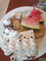 На завтраки каши, йогурты, яйца, омлеты, овощи, картофель и много другого. Выпечки много и фруктов (бананы, яблоки, апельсины, арбуз и фруктовые салаты). Вкусный кофе и чай. Также хороший выбор соков, в том числе и натуральный томатный. На ужин мясо, рыба, рис, пюре, макароны, салаты, зелень, оливки и много тортиков и пирожных. Голодным точно не останешься. Хорошо, что мы не взяли все включено, итак с двухразовым питанием переедали.