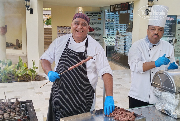 Теперь о поварах. Они молодцы, трудятся добросовестно, стараются. Готовят очень вкусно. Питание в отеле отличное и разнообразное и каждый вечер - новое меню. Хотела обратить внимание руководства на одного повара, фото его я прикрепила к отзывам. Он на фото в чёрном фартуке. Вот он - лицо Вашего отеля и пример для подражания! Нет, я не хочу обидеть никого из персонала, все молодцы, но этот повар просто лицо отеля. Он всегда всех, кто подходит к нему за нарезками (повар всегда резал и подавал индейку, утку, теленка или на ужин готовил шашлыки, люля-кебаб) каждому приветливо улыбается, вежливо уточняет надо ли ещё и он никогда, в отличие от некоторых, не показывал, что он устал, или ему лень работать. Очень приветливый и доброжелательный, и заслуживает от руководства дополнительной премии. Очень добросовестный и трудолюбивый повар!