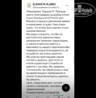 сожалению, от скудоумия ума, вашработник. Посчитал, что это была взятка, и что я сама им засовывала в руки чаевые. Зачем, скажите зачем так, искажать. Я понимаю, что лучшая защита - это нападение. Но я не позволю обижать себя. Я к конфликту супруга не допустила. Я понимала, что возможно он этого и ждал. Когда он орал на меня, тыкал пальцем, сотрудники отворачивались и опускали глаза, было видно, что им стыдно за него. Но никто ничего поделать не мог. ответственность он переложил на меня, на меленькую женщину, на женщину которая годится ему в мамы, на человека который заплатил за отдых, а получил поддых. Я не писала отзывы под псевдонимом, в опроснике я указала номер комнаты, свой номер телефона, электронную почту.Я открыта для диалога. Но вместо того, чтобы изучить ответы, пригласить спокойно отдать этот странный распечатанный на принтере чек, без подписи, без печати, ну ладно Бог с ним, извиниться, сказать что заработались и не сразу отдали документ мне, то есть чек. И все, конфликта нет. А что сделал ваш работник , он меня обвинил во всем, что якобы я его выставила обманщиком и вором. Представляете