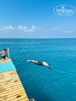 В-третьих, пляж достаточно чистый, но галька. Поэтому берите обязательно аквашузы. Потому что с ребенком на руках выходить очень больно. Шезлонги заняты с самого утра, поэтому нужно пытаться занять пораньше. Одно из развлечений на пляжу - это прыжки с пирса. Вода, конечно, наичистейшая👍👍👍и теплая.