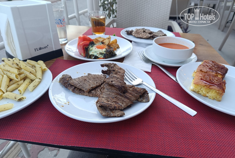 Обед состоял из непонятного жидкого супа, гуляша из которого нужно вылавливать мясо, трёх гарниров (которые подаются в течение нескольких суток подряд), овощей. Также в отдельном месте готовят пиде. Есть фрукты и пару простых десертов.