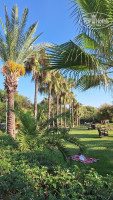От отеля к морю идет подземный переход, и вот после него,перед морем есть ухоженная зеленая территория. Столики, лежаки, гамаки,кресла, очень красивая растительность и куча котиков)