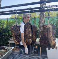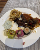 Еда в отеле вкусная. Мешанины очень мало. Соленная красная рыба есть и на завтрак и на обед и на ужин, но какими-то обрезками. Есть свежевыжатый апельсиновый сок, который на завтрак можно давить самому, но там постоянно очередь. Рыбу целую жарят каждый день. Из мяса говядина, курица, индейка. Почти нет солений, но очень много оливок и маслин. Один раз в неделю рыбный день. Дают роллы ( из крабовых палочек), креветки, карпачо из тунца.