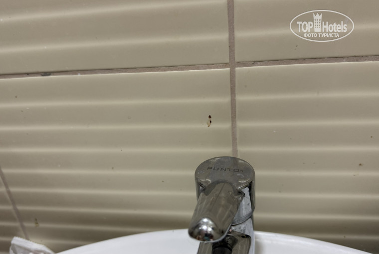 В санузле стеклянные дверцы кабины не моют, все в известковых потеках. Над раковиной на плитке засохли чьи-то сопли, двери в местах, где ручки все в вековой грязи, поэтому пожелтели - это все было при заезде. Постельное белье с дырками, старое. На каждого по 1 маленькой подушке. Матрас составной: два больших матраса, а сверху один большой матрас, при че настолько большой, что его края свисали по 20 см с каждой стороны и он все время съезжал.