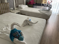 Приехали в отель мы рано утром, но нам сказали, что номер будет готов не ранее, чем в обед. За дополнительную плату можно было повысить категорию номера и заселиться сразу, но мы решили подождать. Пользоваться всеми услугами отеля можно сразу по приезду. Мы позавтракали, переоделись в спа-центре и сходили на пляж. В итоге номер нам дали только после обеда (кстати ровно такой же, в который можно было утром заселиться за допплату). Номер стандартный, но довольно просторный: двуспальная и односпальная кровати и довольно спокойно встала детская кровать и коляска. Балкон выходил как бы на крышу лобби, другой корпус отеля и с боковым видом на бассейн и горки.