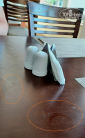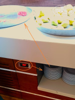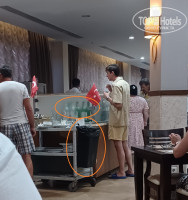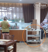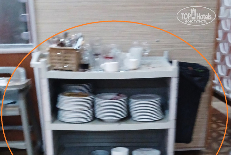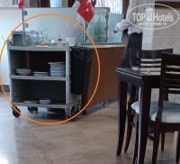 Обслуживание в ресторане: Сбор грязной посуды осуществлялся самым вульгарным способом. Массивные тележки с грязной посудой и контейнером для сбора пищевых отходов устанавливались прямо в залах ресторана (Фото 1), в основном около стоек с напитками (Фото 2 и 3). Бокал вина приходилось заказывать и ожидать, стоя рядом с контейнером для отбросов, закреплённым на перепачканной брызгами старой еды и заполненной стопками грязной посуды тележке (Фото 4). Такой низкий уровень сервиса не встретишь даже в дешёвой придорожной столовой, а для ресторана с 5 звёздами это далеко за гранью допустимого. В своё время мне приходилось работать официанткой в гостинице Штейгенбергер, сервировать завтрак на террасе в саду. Чтобы отнести использованную посуду, нужно было вернуться в здание и пройти ещё два зала до внутренних помещений кухни. При этом собрать посуду можно было только с одного стола. Подойти к гостям с подносом, на котором уже громоздилась грязная посуда, было недопустимо. Должна высказаться в защиту официантов – они старались из всех сил и делали всё, что от них зависело. Но персонала было явно недостаточно на такие большие залы. Только усилиями официантов было невозможно исправить отвратительную организацию обслуживания. Наблюдали сцену, когда мужчина, очевидно, какой-то начальник, делал фото стола с грязной посудой и отчитывал убирающую посуду официантку за то, что она, на его взгляд, делала это неправильно. Это говорит, прежде всего, об отсутствии квалификации у самого начальника официантов. Хороший руководитель сам помогает убирать посуду, если видит, что его подчинённые не справляются. А отчитывать персонал допускается только на кухне при закрытых дверях и ни в коем случае в зале при гостях. Управляющему рестораном в первую очередь стоило бы обратить внимание на недостаточную чистоту посуды. На стаканах нередко были видны мыльные разводы (Фото 5), на вилках и ножах засохшие следы пищи. Кстати, в Штейгенбергере работники ресторана были обязаны все столовые приборы после мытья в посудомоечной машине вручную натереть полотенцем до блеска. Ну хорошо, что хоть вилки и ножи были из металла, а вот чайных ложек совсем не было. В 5 звёздочном ресторане сахар приходилось размешивать деревянной палочкой (Фото 5). О чистоте помещения трудно сказать что-то позитивное – на столах и стульях давнишние грязные отпечатки (Фото 6), несколько окон настолько мутные, что, вероятно, их не мыли ещё со времени постройки гостиницы (Фото 7 и 8). Совершенно абсурдно были расставлены блюда по стойкам без соответствия их предназначению. Подносы с фруктами и пирожными помещались на стойках с функцией подогрева тарелок до 32,2°C - 35,6°C (Фото 9 и 10). Возникает вопрос – зачем класть арбуз на горячую тарелку? – Чтобы он быстрее прокис? А пирожное с желе скорее растаяло? А вот горячие блюда размещались на стойках без подогрева тарелок и быстро остывали от холодной тарелки (Фото 11).