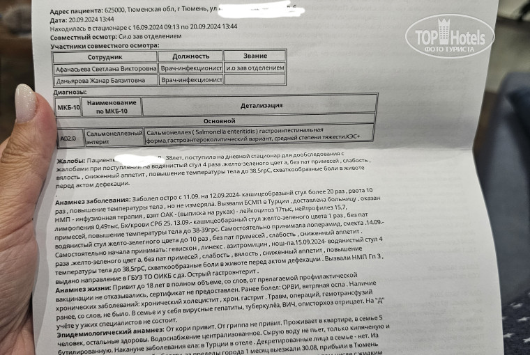 Отпуск прошел ровно, без особых впечатлений, зато под конец их было с лихвой. В ночь перед вылетом меня забрала скорая еле живую с сильнейшей диареей и рвотой. Мне так плохо никогда не было, хорошо что вещи собрала накануне. Увезли меня в Анталию в госпиталь, диагноз -кишечная инфекция. Там прокапали физраствором и выписали- это отдельная история. Надо отдать должное отелю, они предлагали трасфер из больницы обратно и бесплатно продлили номер. Я приехала, отлежалась. Кое-как долетела, дома стало снова совсем плохо, лечилась сама как могла, в итоге попала в инфекционную больницу с диагнозом Сальмонеллез (!!!). Ладно бы ротавирус- море, есть риски, но сальмонелла- это только от того, чем меня накормили в отеле!!! С нами были друзья с двумя детьми, так вот им стало плохо в самолете- отравились всей семьей! Мы все ели разную еду, дорожки сошлись только на чизкейке Сан-себастьян из кондитерской в лобби. Слава Богу, моя трехлетка и мой муж это не ели, досталось вся мука мне.